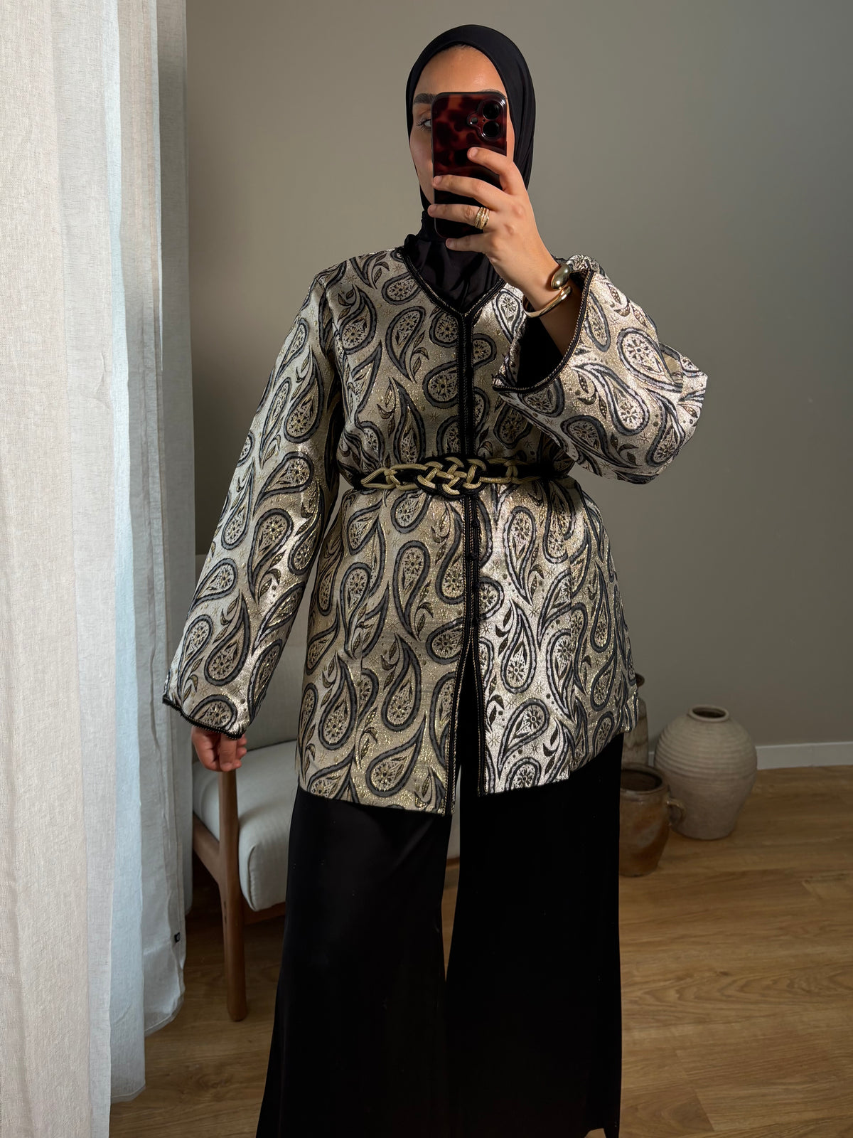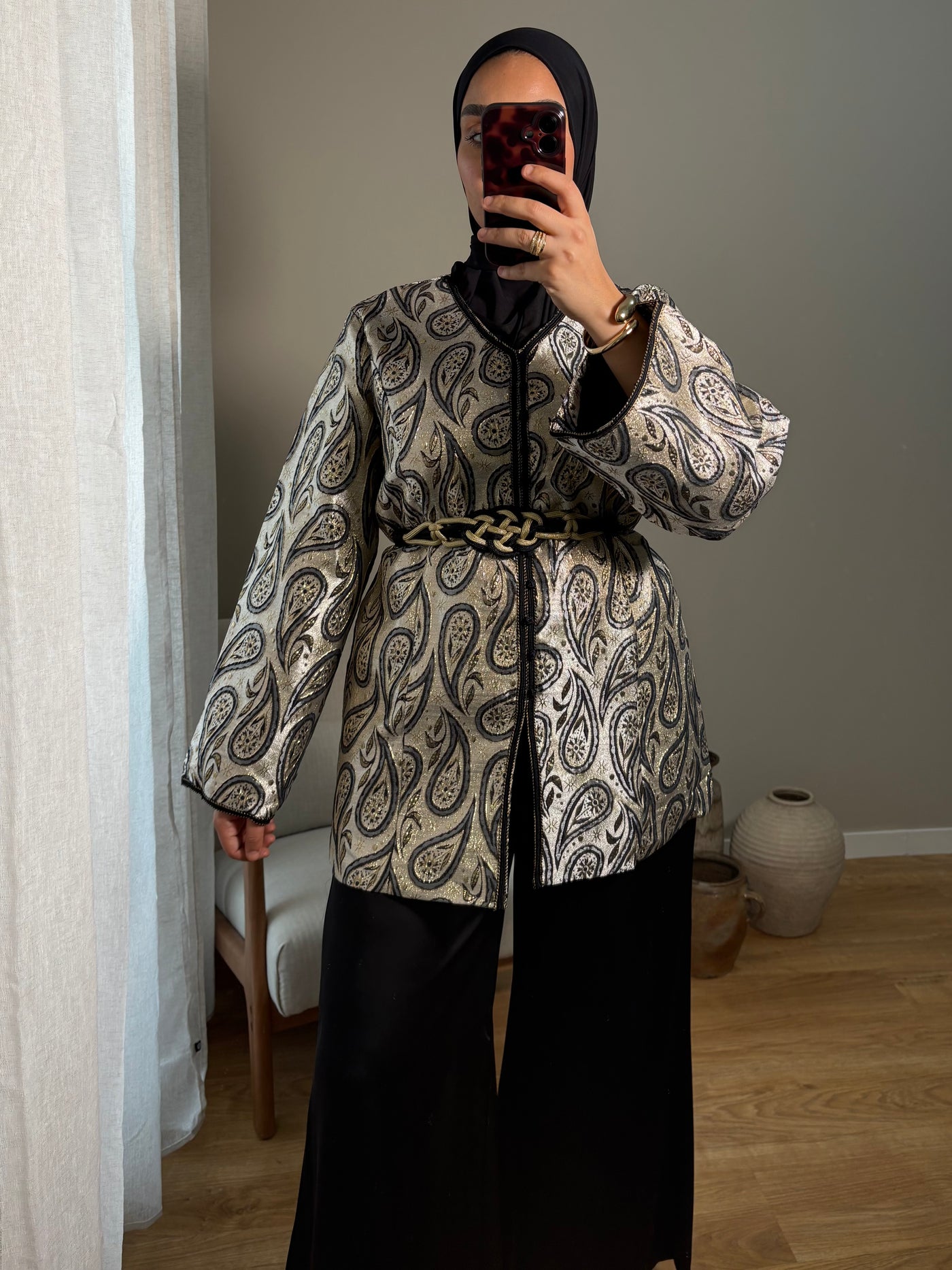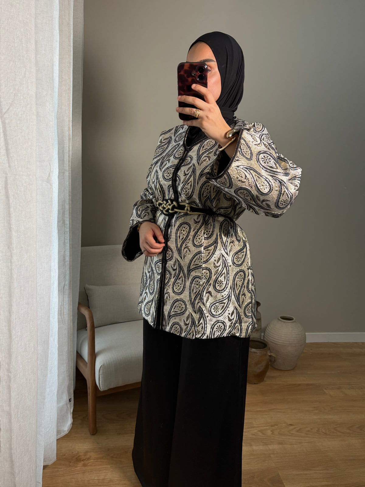 Vue rapide Ensemble trois pièces (Haut, bas et ceinture) Tissu jawhara fluide Trois tailles disponibles...