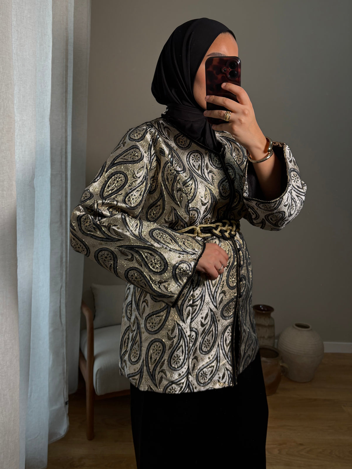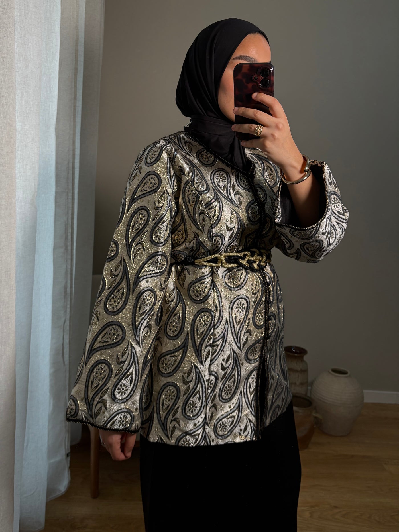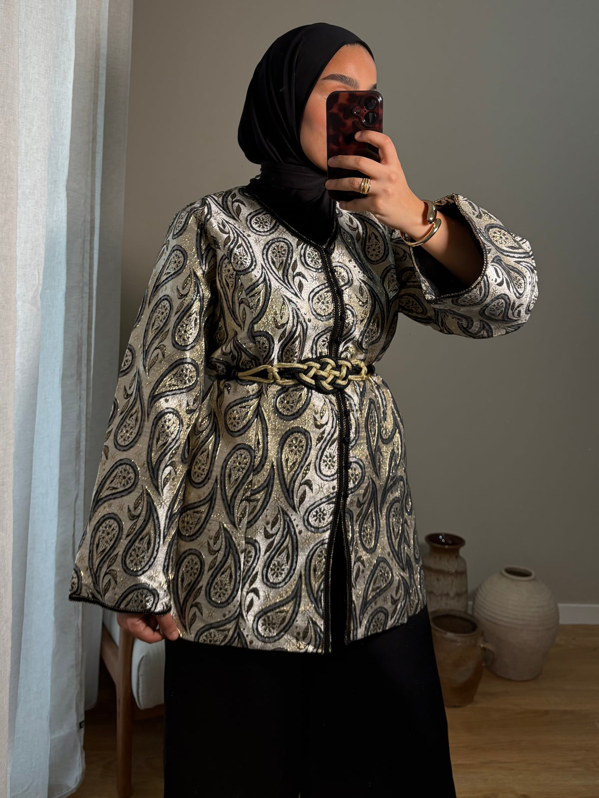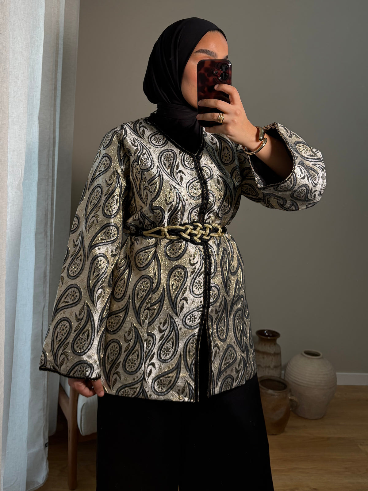 Vue rapide Ensemble trois pièces (Haut, bas et ceinture) Tissu jawhara fluide Trois tailles disponibles...