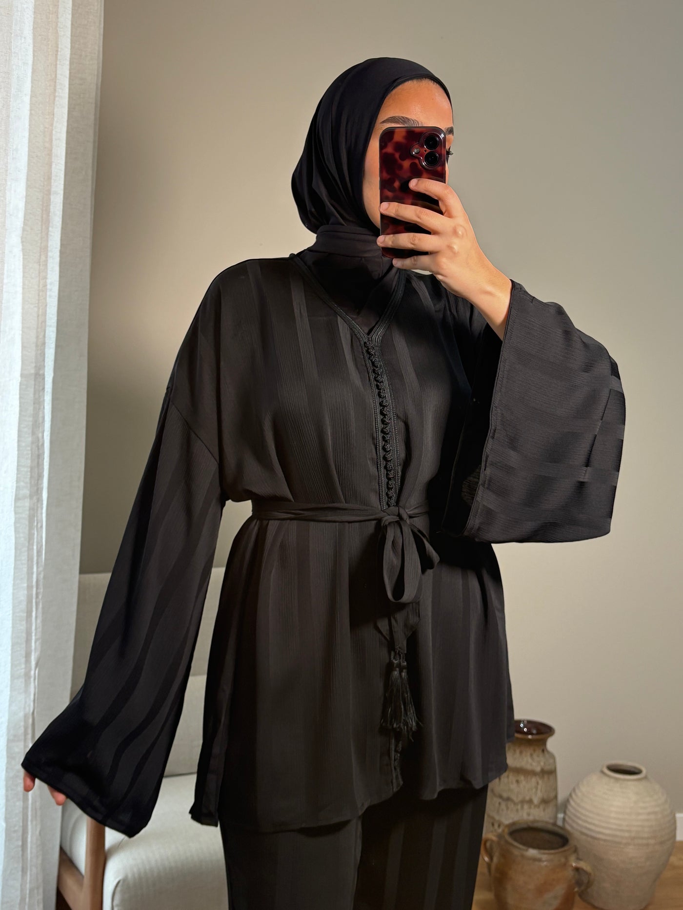 Vue rapide Ensemble trois pièces (Haut, bas et ceinture) Tissu jawhara fluide Trois tailles disponibles...