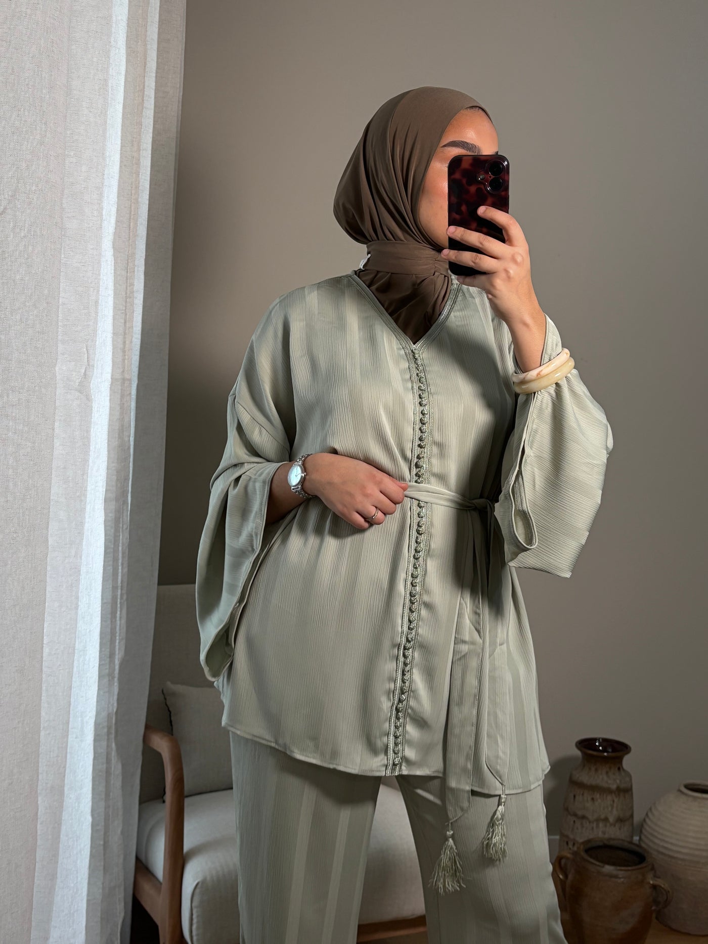 Vue rapide Ensemble trois pièces (Haut, bas et ceinture) Tissu jawhara fluide Trois tailles disponibles...